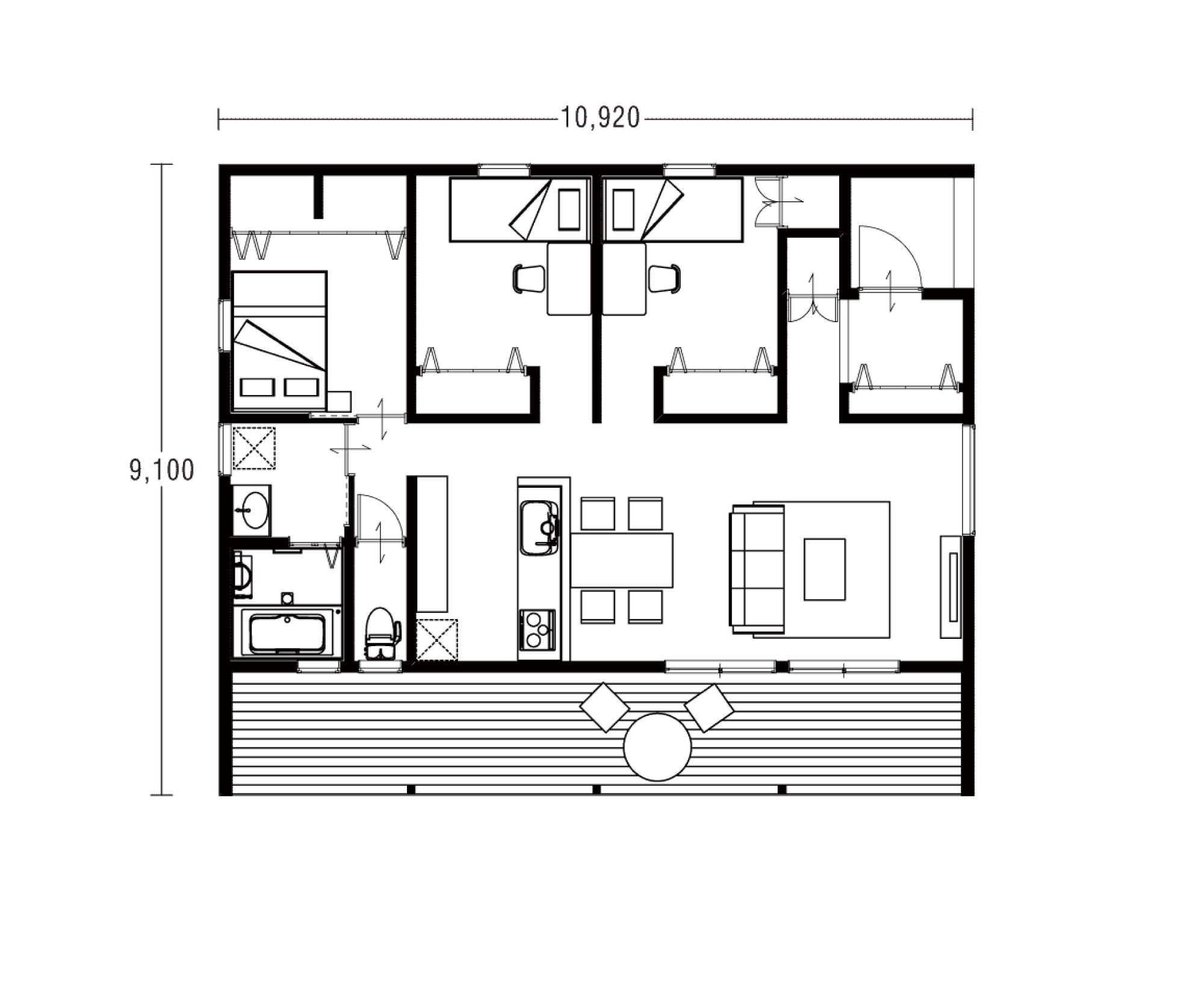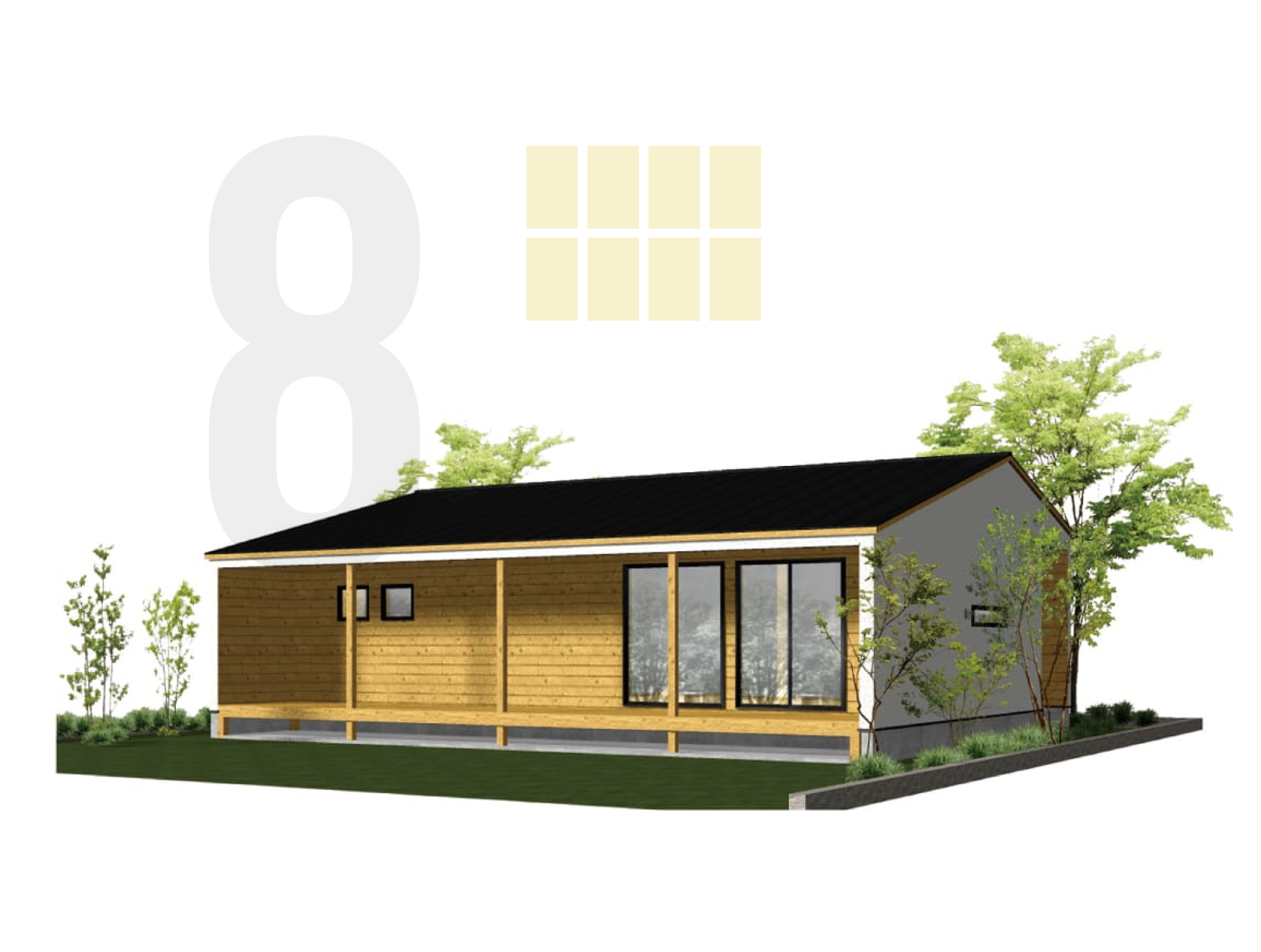 8つのcagoをタテに並べた住居スタイルで、落ち着きを感じさせる三角の切り妻屋根と、家の幅いっぱいに広がるウッドデッキが特徴。LDKとバスルームがウッドデッキに面しているので、外の風景や自然の光をぞんぶんに取り込みながら心地よく暮らせます。